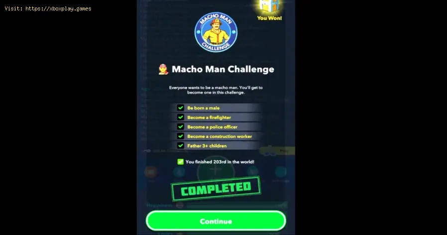 The "Macho Man" challenge in BitLife consists of five objectives:
