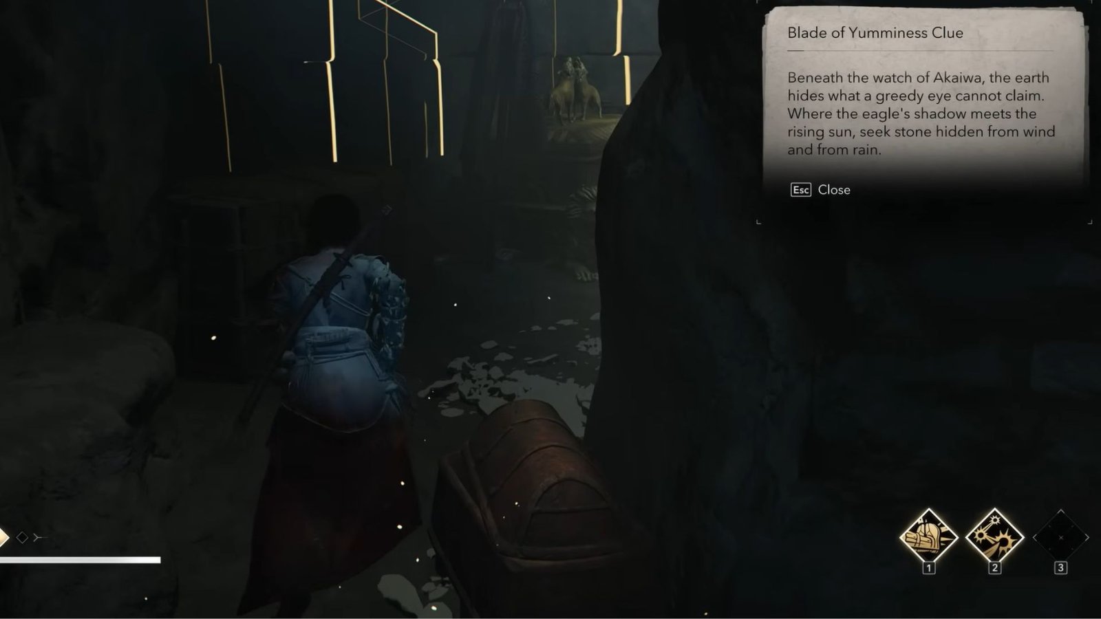 Fundort: Die Reise beginnt dort, wo sie endet. Die Schwertscheide befindet sich in der Isu-Höhle. Nachdem ihr sie mit Yasuke und dem Rätselrollen-Leuchtfeuer betreten habt, durchsucht die Kammer gründlich. Sie liegt oft in einer Ecke oder einer Seitennische und wartet darauf, entdeckt zu werden. Dies ist das erste Teil, das ihr erhaltet und das euch auf den Weg bringt, das vollständige Katana wiederherzustellen.