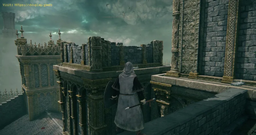 Keep going south until you reach the narrow rocky ledge and head towards the narrowest part. In the archway to the right, you should find a knight you can duel against, but it's best to just walk past him. Go through the archway and up the ruined stairs > turn left to access the tower and stand on the button in the center of the Rampart Elevator to activate it.