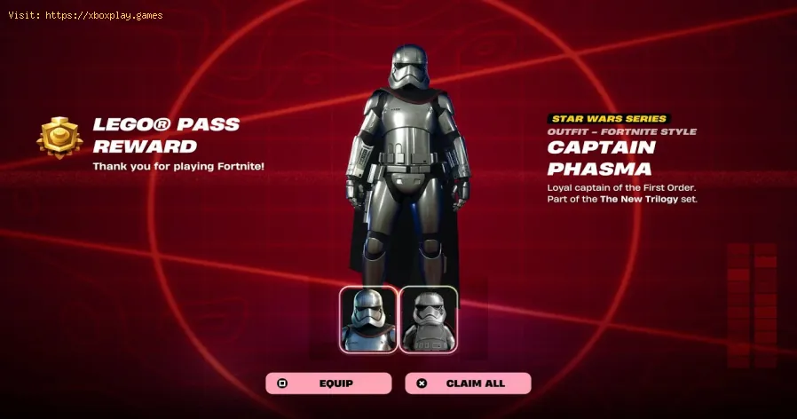 Captain Phasma skin will be automatically awarded to your account. There is no need to complete any specific challenges or level up within the pass to unlock this particular skin. It's an instant reward for participating in the First Order LEGO Pass event.