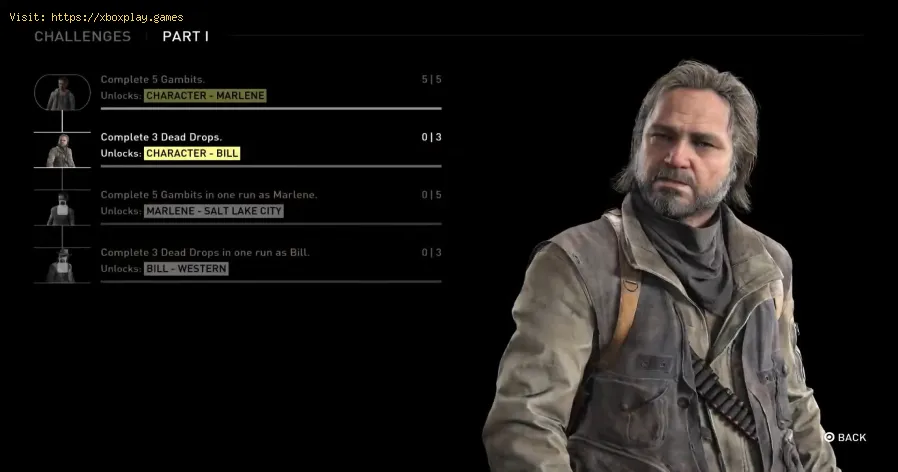 Bill, le contrebandier paranoïaque de The Last of Us Part I, revient en tantque personnage jouable. Contrairement à Marlene, son mode dedéverrouillage repose sur les points de collecte.