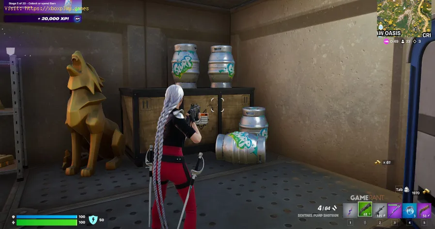 À l'intérieur, les joueurs découvriront plusieurs coffres, des coffresrares, des lingots d'or à récolter et quatre barils à succion,fournissant à la fois de la santé et un bouclier. Cette salle offre uneforte probabilité d'obtenir plusieurs armes épiques ou légendaires,ainsi que des boucliers supplémentaires, permettant aux joueurs deconserver tous les objets de soin précédemment acquis. Après avoirrécupéré le butin, les joueurs peuvent sortir par le même ensemble deportes doubles ou utiliser les toilettes portatives disponibles.