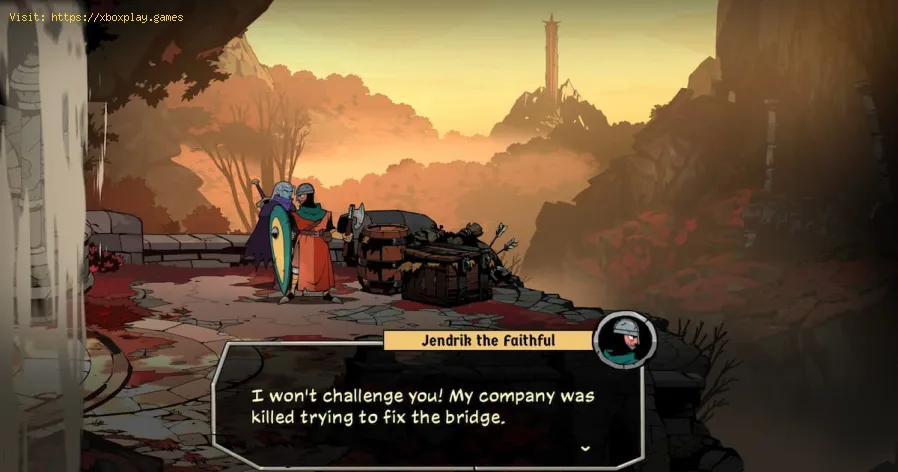 - Confirmer la réparation: Retournez au pont brisé. Vous y trouverez Jendriuk le Fidèle , qui se tient au bord de la structure brisée.