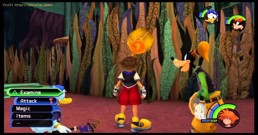 Pour passer le troisième test d'Alice, sautez au sommet des plates-formes de nénuphars pour atteindre un trou dans le flanc d'un arbre de la forêt de lotus. Cela amènera Sora et le gang à la salle Bizarre. Même si vous tomberez du plafond, assurez-vous d'atteindre la cheminée et de trouver un autre coffret cadeau contenant Puanteur.