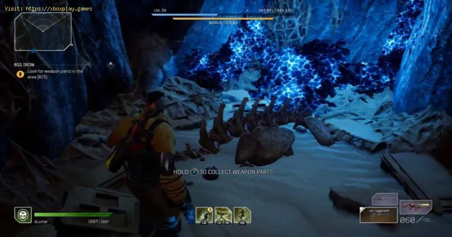 Vous pouvez trouver le premier morceau de l'arme dans la grotte, sur le mur sur le côté gauche de la grotte, où vous pouvez voir le message lorsque vous vous approchez du tas d'os.Lorsque vous aurez la première partie, vous devrez sortir de la grotte vers la section étroite fermée par quelques rochers. À ce stade, vous devrez tuer tous les ennemis qui se trouvent ici> puis vous devrez continuer vers la droite jusqu'à ce que vous atteigniez une zone différente et la deuxième pièce de l'arme sous des roches bleu vif.Pour le dernier, vous devrez avancer par une porte en bois qui est ouverte et vous devrez tuer plusieurs ennemis. Ce qui vous permettra de vous rendre à l'arrière du village où vous trouverez le chasseur et aux marches pour trouver la dernière pièce de l'arme.