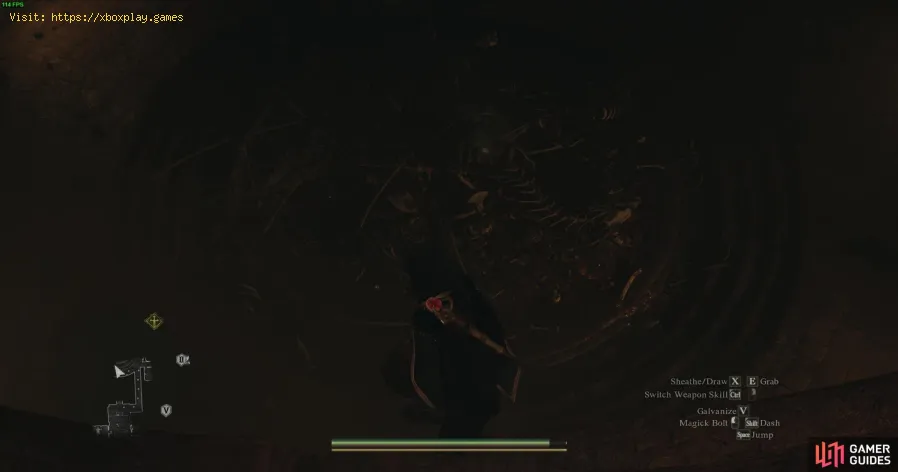 Para chegar ao local de descanso dos Porta-Chamas, devemos primeiro ir para Battahl. Partindo da cidade de Bakbattahl, seguiremos o caminho que segue para oeste e depois para noroeste. Vamos nos preparar para enfrentar inúmeros inimigos pelo caminho. Contanto que sigamos o caminho marcado no mapa não teremos problemas para chegar ao nosso destino. Finalmente, nos aproximaremos da base de uma montanha rochosa. Aqui encontraremos a entrada para o local de descanso dos porta-chamas, embora esteja bloqueada por destroços. Parece que a caverna não pode ser acessada durante o jogo principal, após o jogo, ou mesmo no NG. Permanecerá incerto se a caverna estará acessível no futuro, possivelmente através de DLC. Porém, por enquanto podemos descobrir a localização e adicioná-la ao nosso mapa.